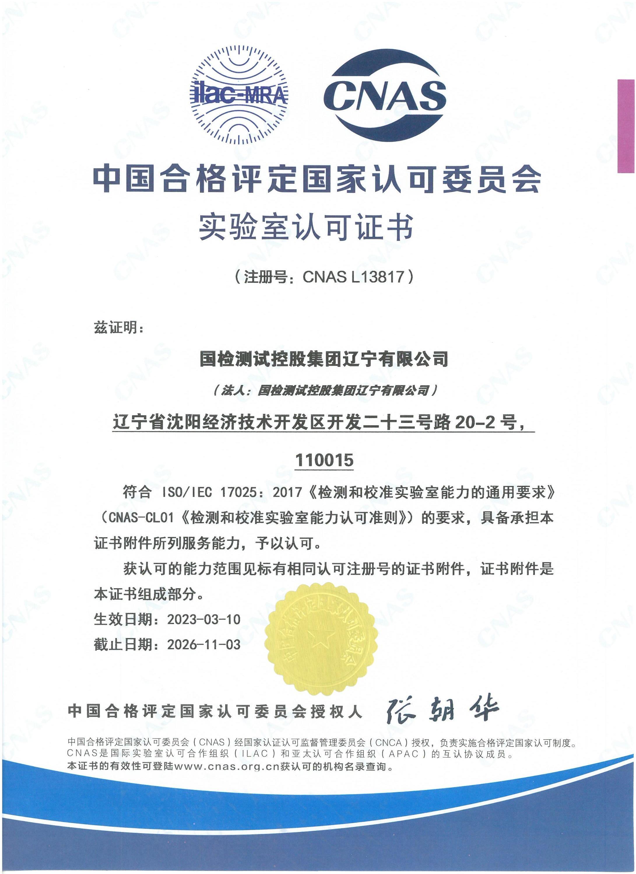 實(shí)驗(yàn)室認(rèn)可證書: